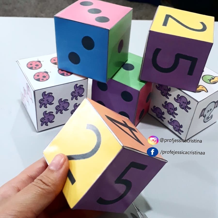Olá pessoal!! Confeccionei esses dados para trabalhar com a minha turminha na educação infantil! É muito importante representar as quantidades e números de todas as formas possíveis! Estou ensinando-os à utilizar os dados.